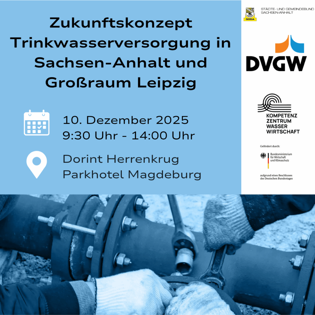 Das Kompetenzzentrum Wasserwirtschaft lädt herzlich zum Workshop am 10. Dezember 2025 ins Dorint Herrenkrug Parkhotel Magdeburg ein. Gemeinsam mit dem Städte- und Gemeindebund Sachsen-Anhalt e.V. sowie der DVGW-Landesgruppe Mitteldeutschland widmen wir uns der Frage: