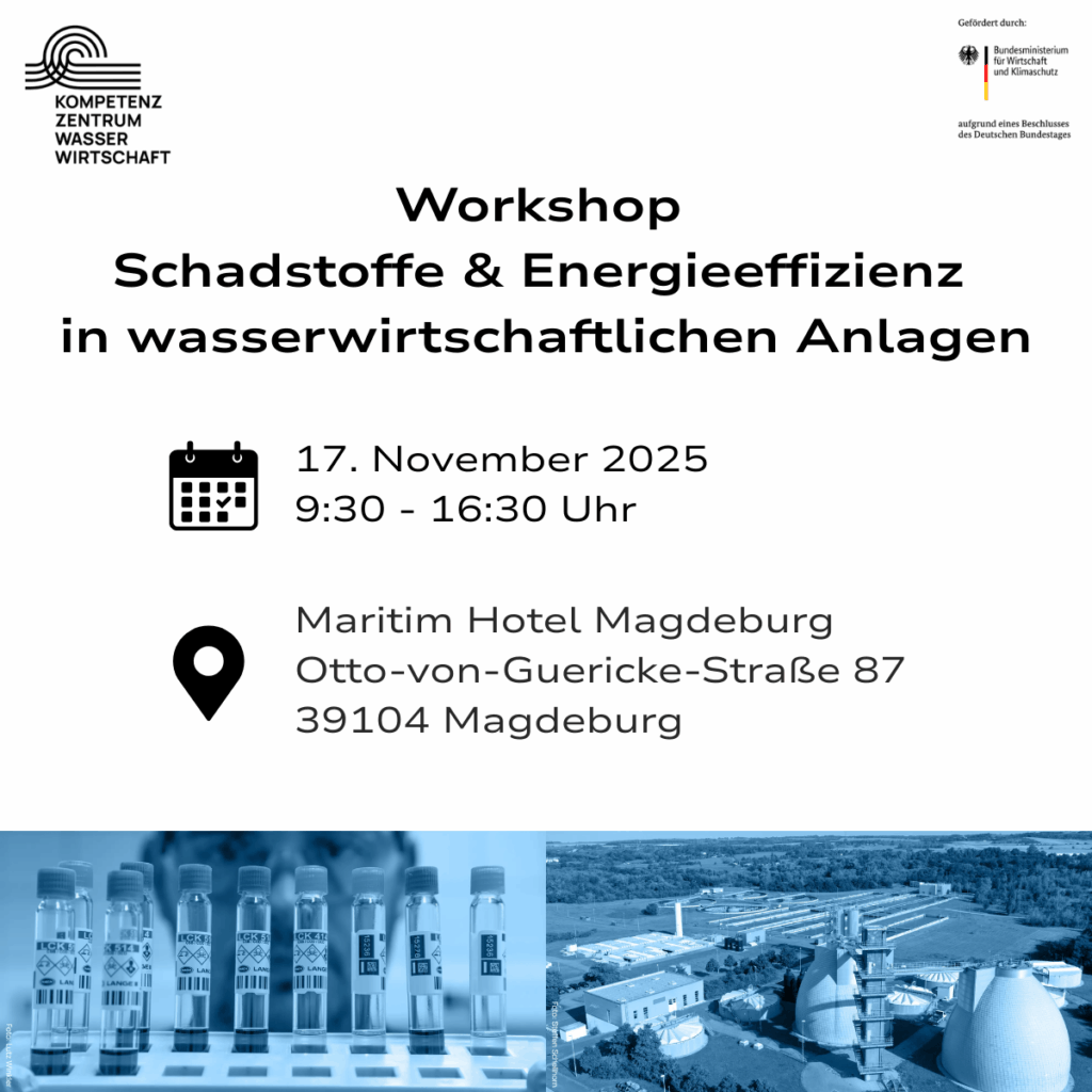 Das Kompetenzzentrum Wasserwirtschaft lädt herzlich zur Teilnahme am diesjährigen Workshop „Schadstoffe und Energieeffizienz in wasserwirtschaftlichen Anlagen“ ein. Die Veranstaltung findet als Präsenzveranstaltung am 17. November 2025 im Maritim Hotel Magdeburg statt.